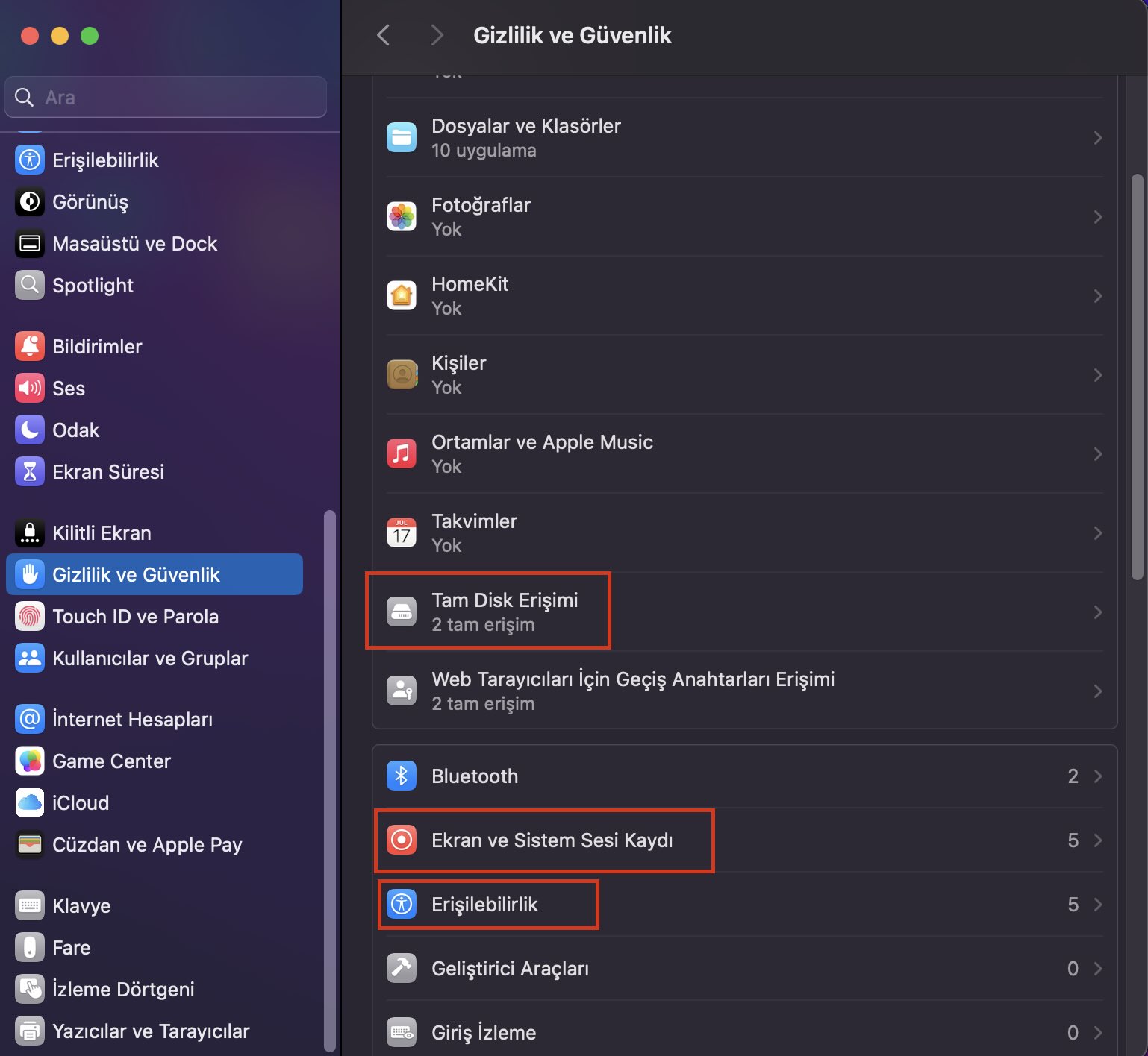 4.İlk olarak Tam Disk Erişimi iznine tıklayınız açılan ekranda uygulamalar listelenecektir.