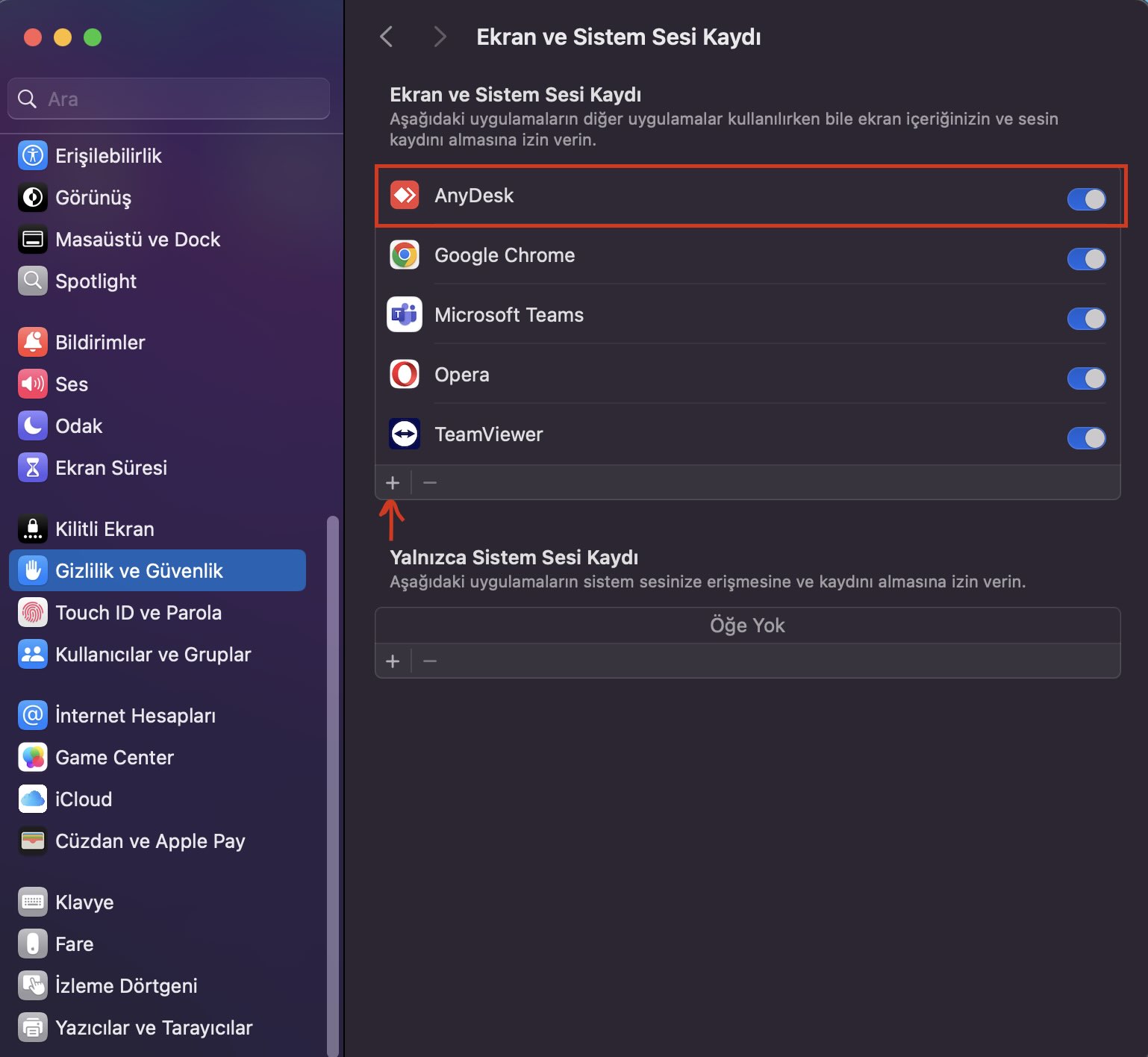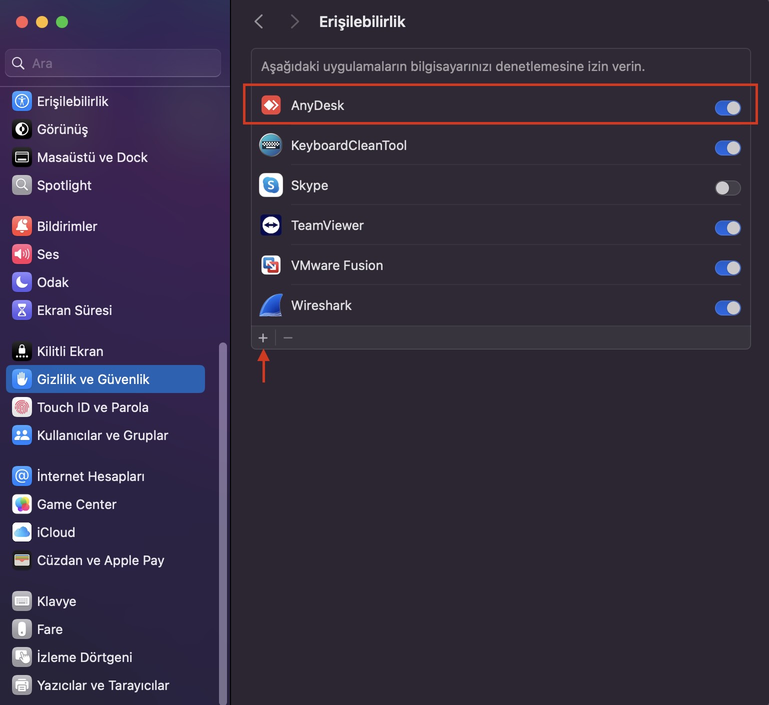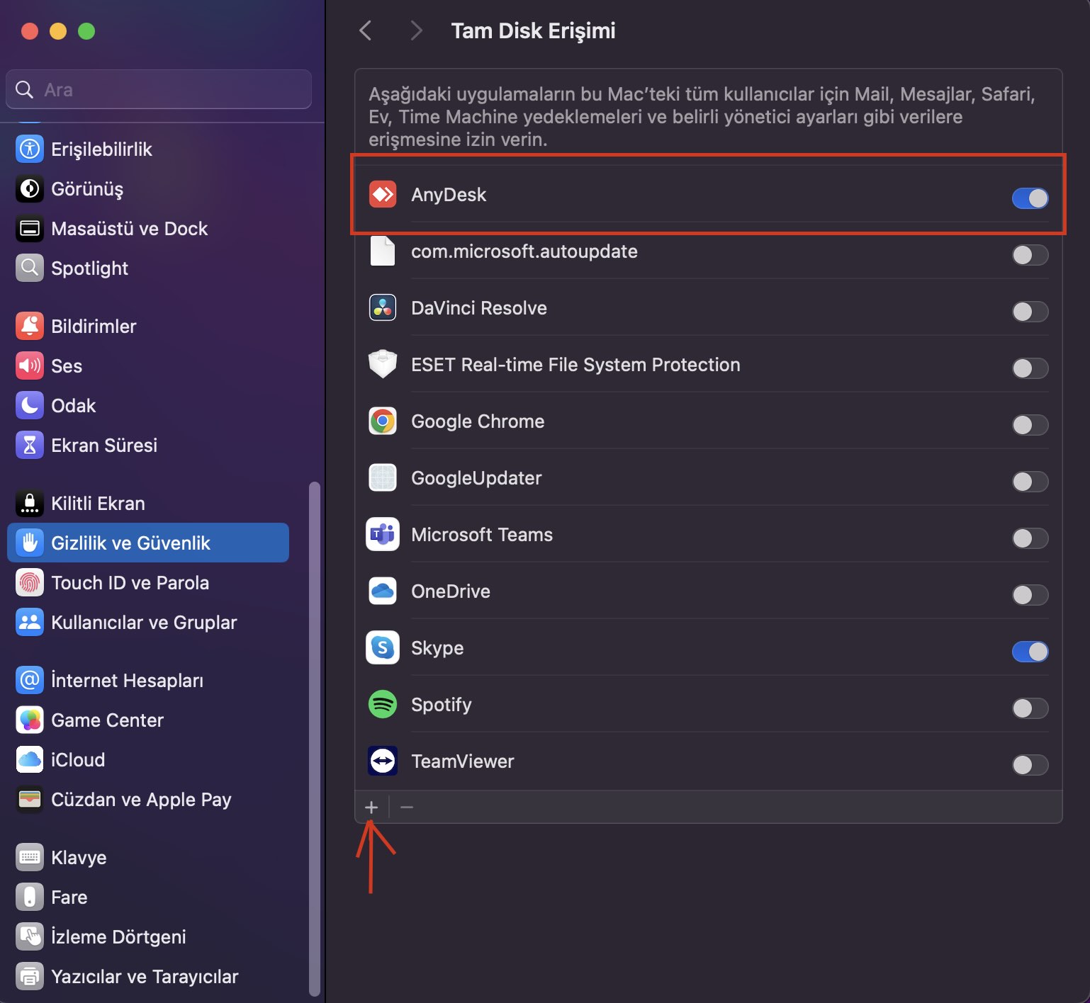 Anydesk gözüküyorsa tik işaretli olarak görünmesi gerekmektedir. Eğer gözükmüyorsa + butonuna tıklayıp anydesk uygulamasını seçiniz ve tiki işaretli halde bırakınız.